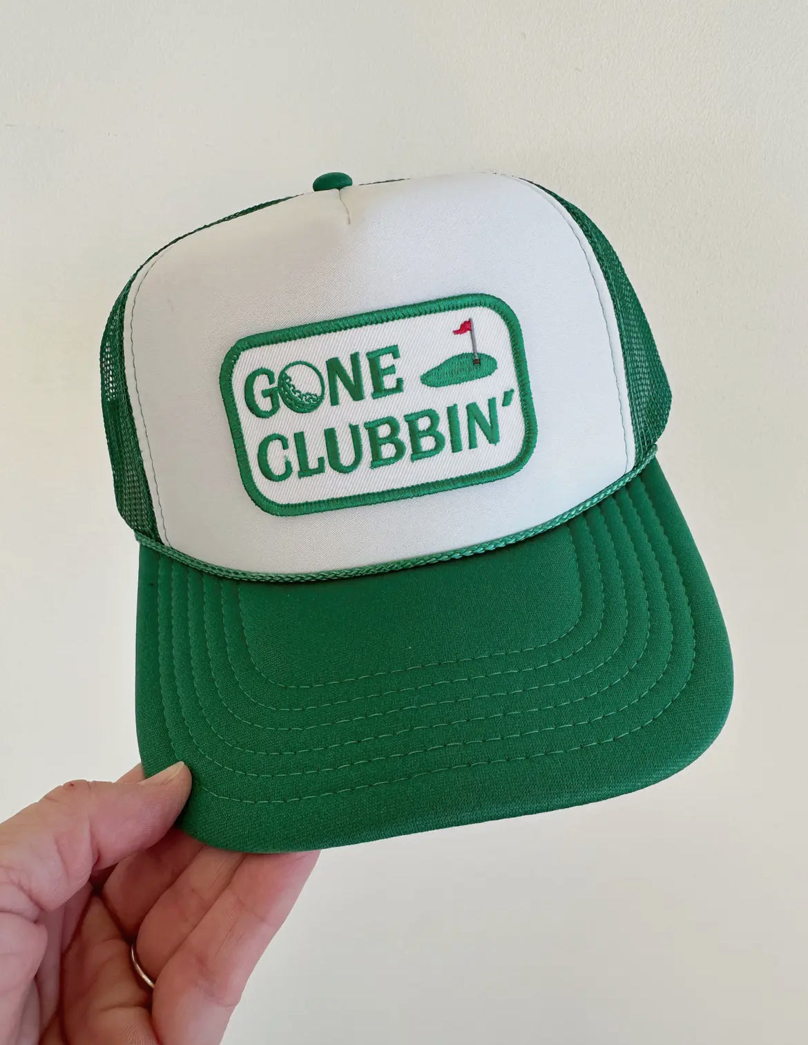 Green and white foam trucker hat with an embroidered patch.