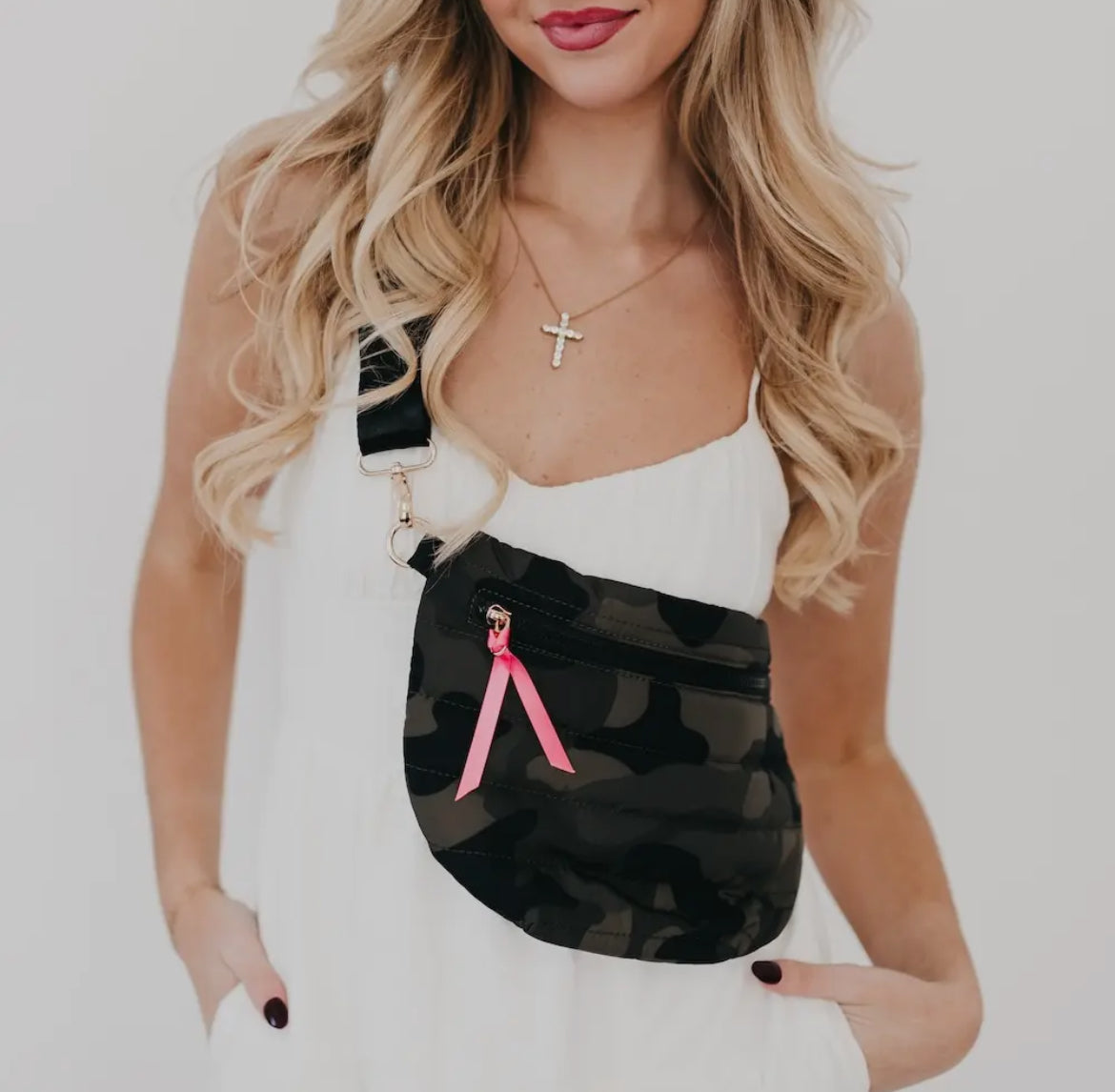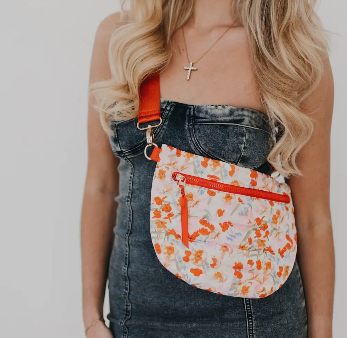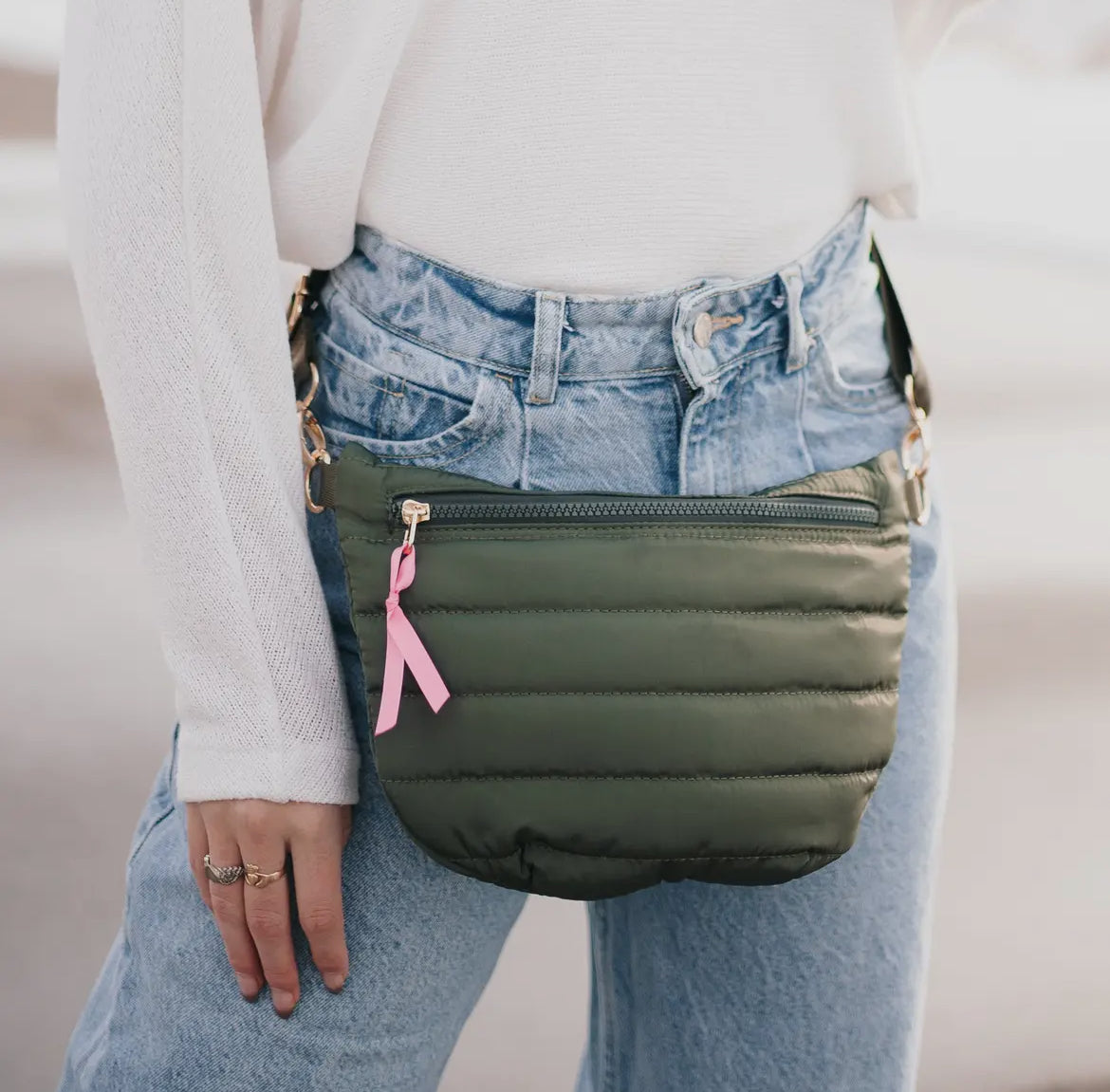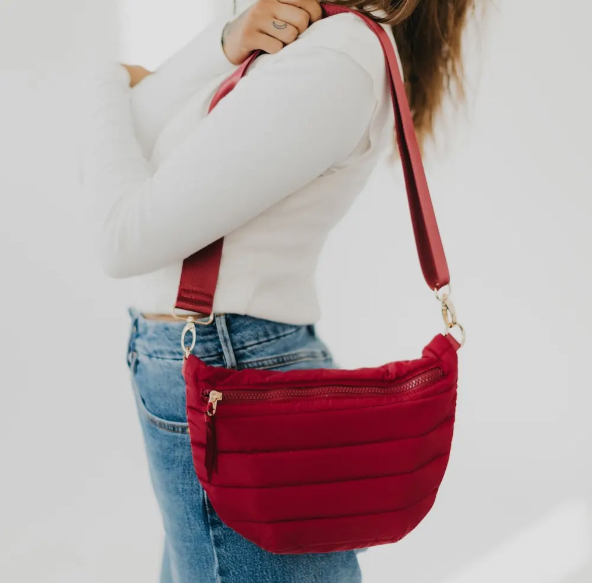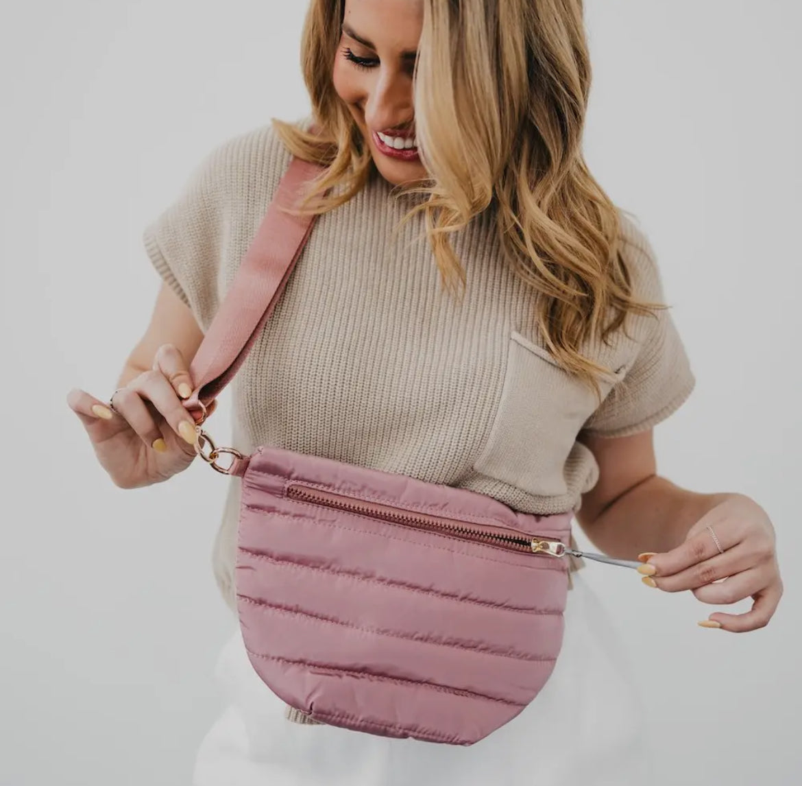 The Jolie Puffer Belt Bag is NEW from Pretty Simple, one of our very favorite brands. A trendy take on the updated fanny pack that can be worn in multiple ways. Wear it as a belt bag/fanny pack, crossbody, or shoulder bag. Features a fun half moon shape with a coordinating shiny canvas strap and gold hardware and a pop of color with ribbon accent. We are obsessed with this style and the front zipper for easy access.