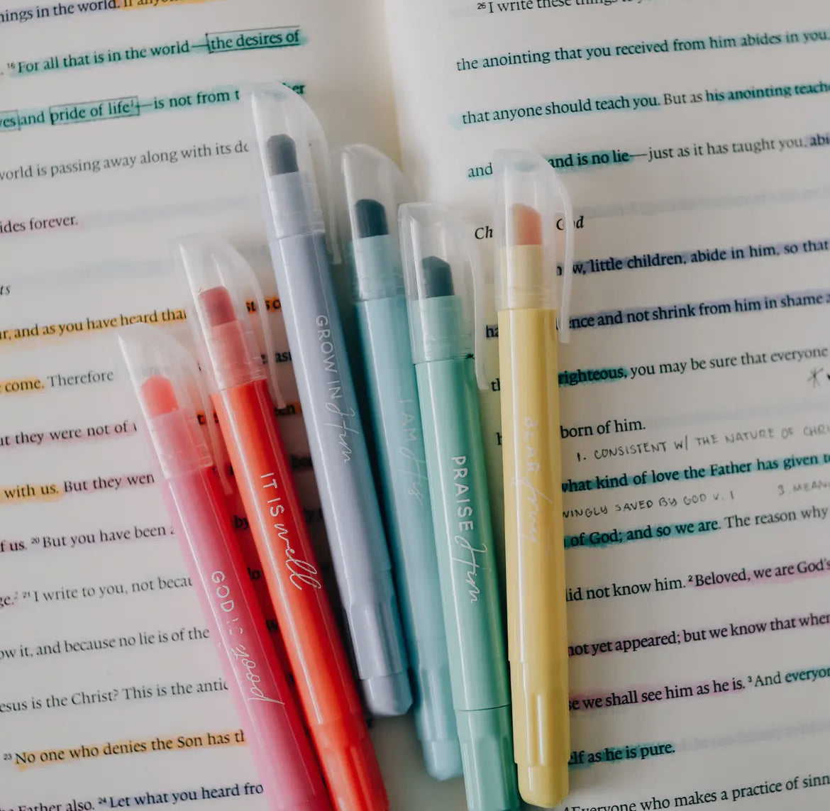 This is a set of six pastel gel highlighters. The set also includes a card with tips for highlighting and space to create your own color coding system. These gel highlighters will not bleed through even thin Bible pages.