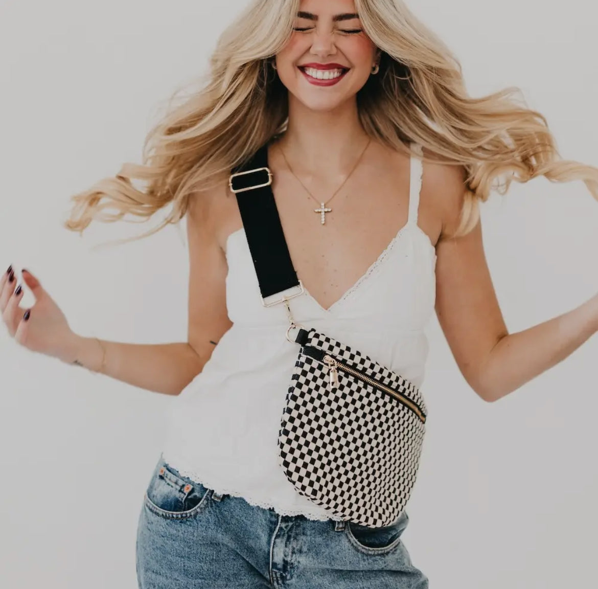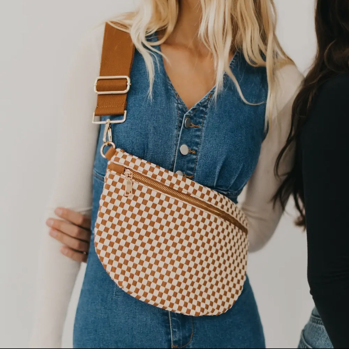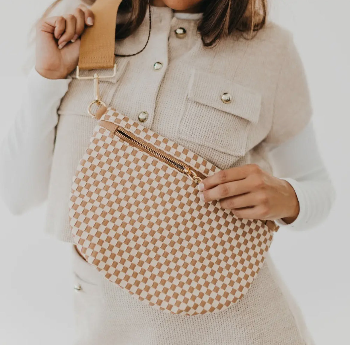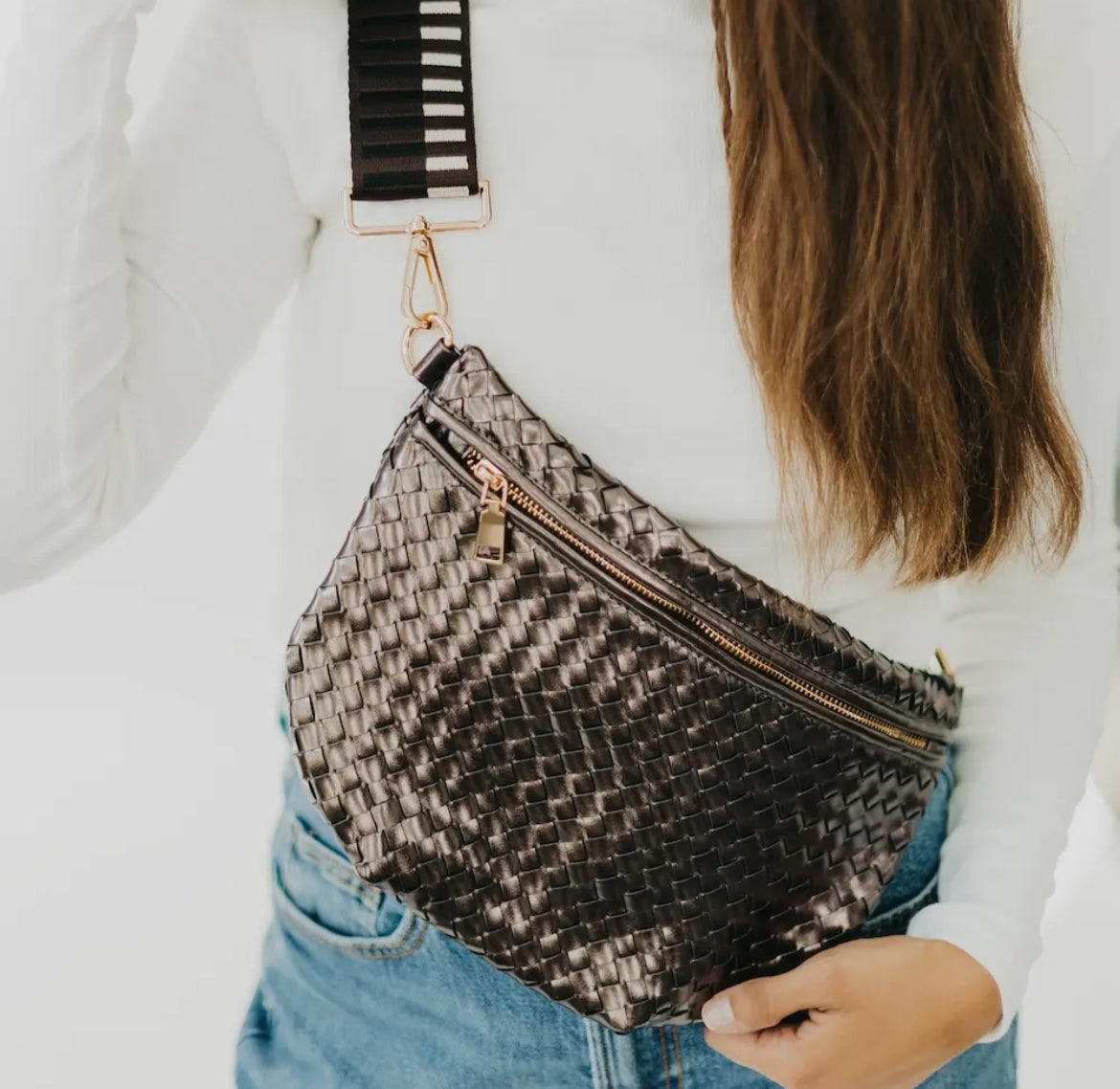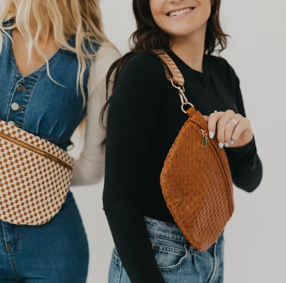 Meet the Westlyn Woven Bum Bag! Gorgeous woven vegan leather with a unique block design on the strap, giving us edgy, rocker vibes. Beautiful hardware with a zipper closure with beige and black chevron interior, and a zippered slash pocket on the inside. This crossbody bag is the perfect accessory to elevate any outfit!